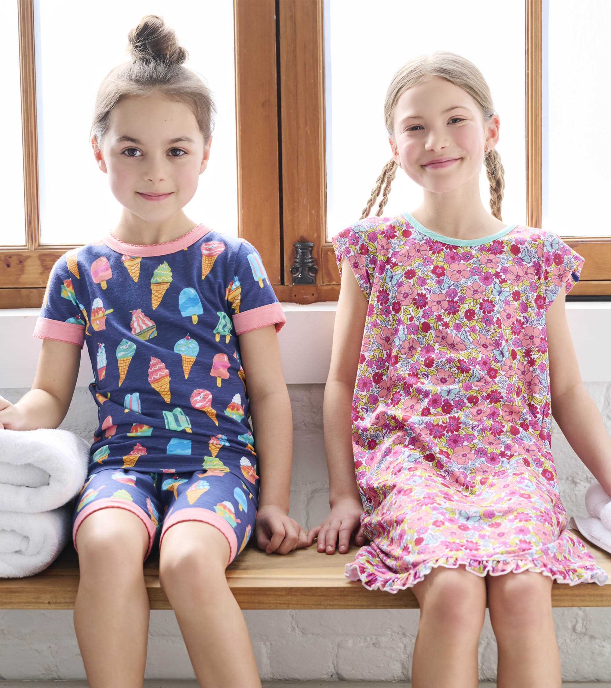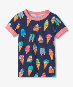 Cool off with the Girls Ice Cream Treats Short Pajama Set! Made from lightweight, organically grown cotton, this set includes a playful ice cream-printed top and matching shorts. Ideal for warm weather, it’s a sweet addition to her sleepwear collection.