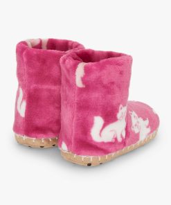 Keep tiny toes toasty in our Girls Little Kitties Fuzzy Fleece Slippers in Pink, made from ultra-soft 100% polyester for all-day warmth. Featuring a cozy slouchy fit and a playful white kitty pattern on dark pink fleece, these slippers charm at every step. The brown micro suede sole with black grip spots and a Hatley logo offers non-slip comfort, while white whip-stitch edging adds a sweet, handcrafted touch.