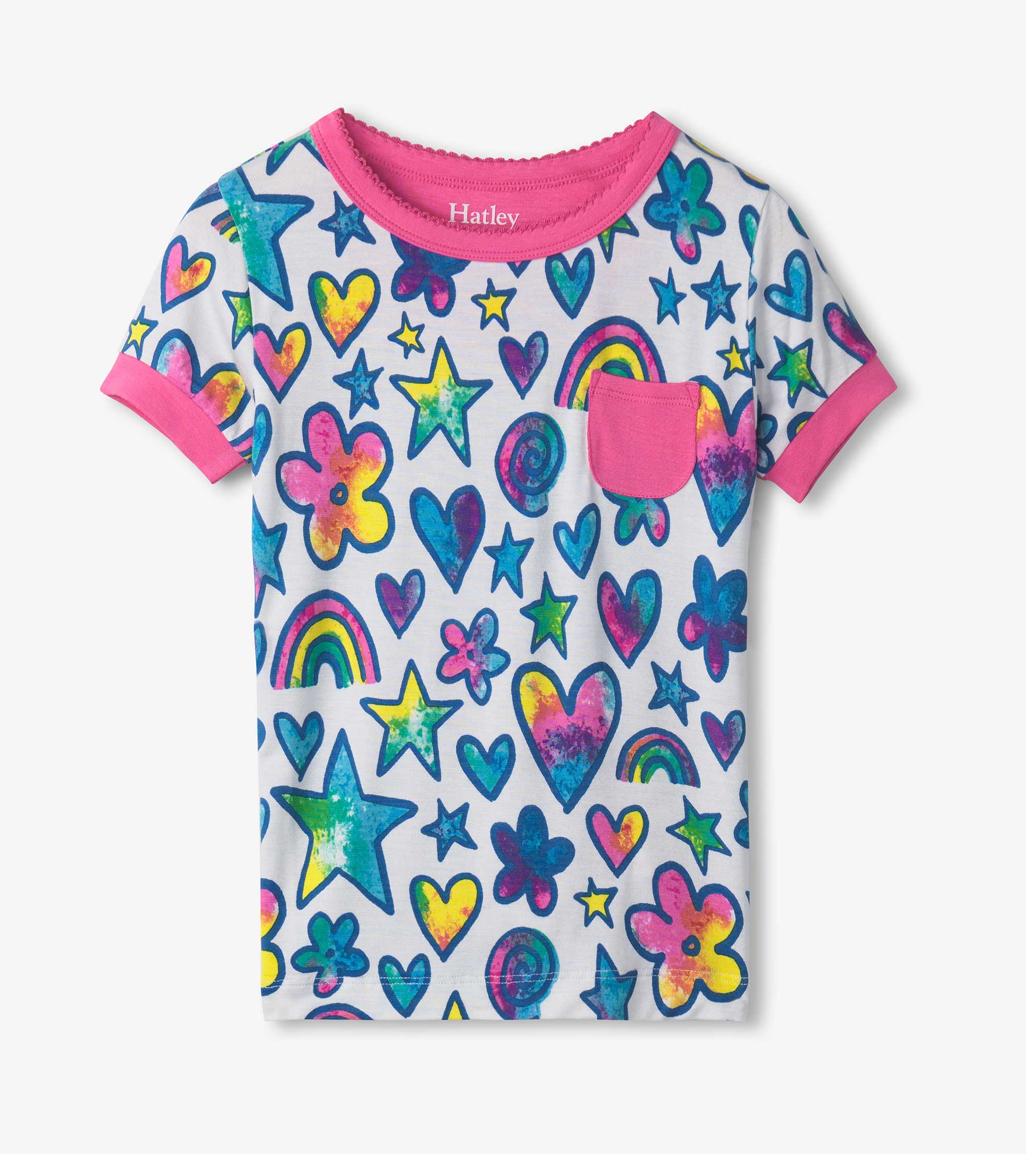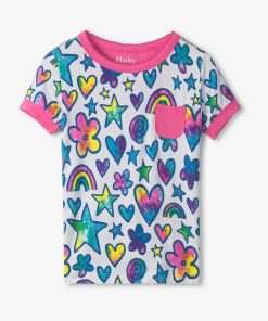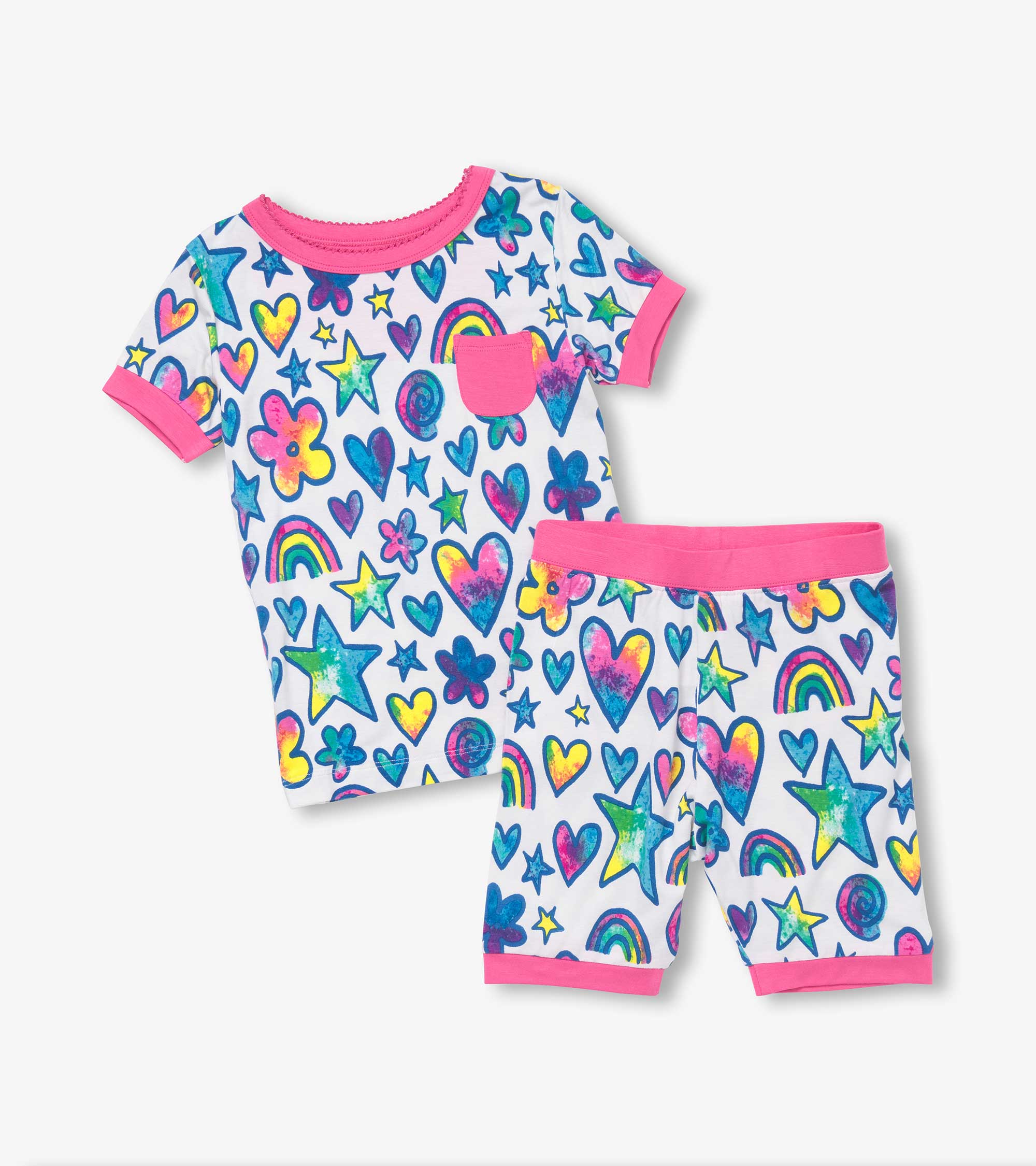 Let her artistic side shine with the Girls Watercolour Doodles Bamboo Short Pajama Set! This two-piece bamboo set features a whimsical watercolor print on a lightweight top and matching shorts. Perfect for warm nights or cozy mornings, it’s as comfy as it is cute!