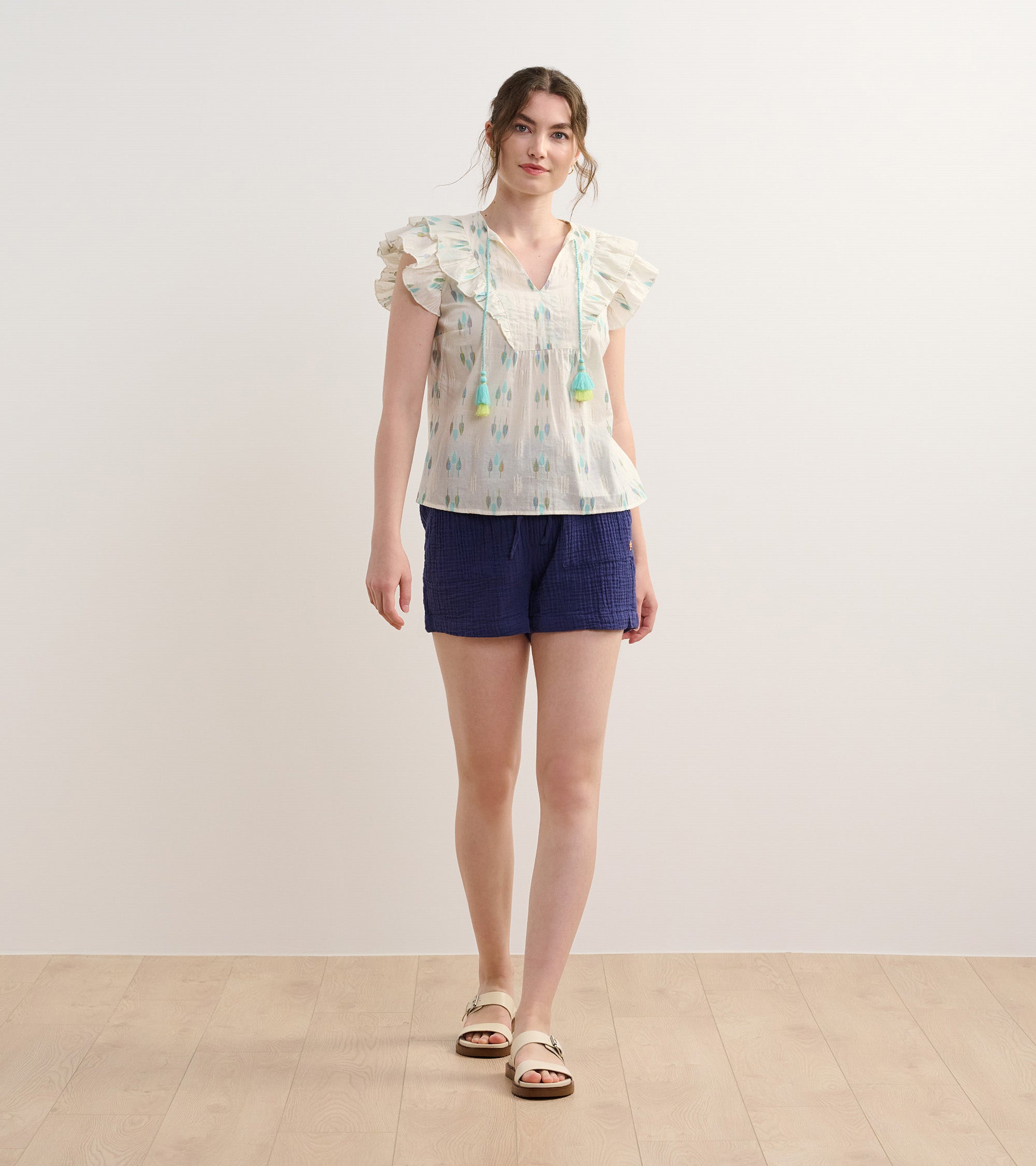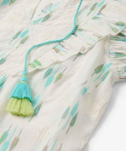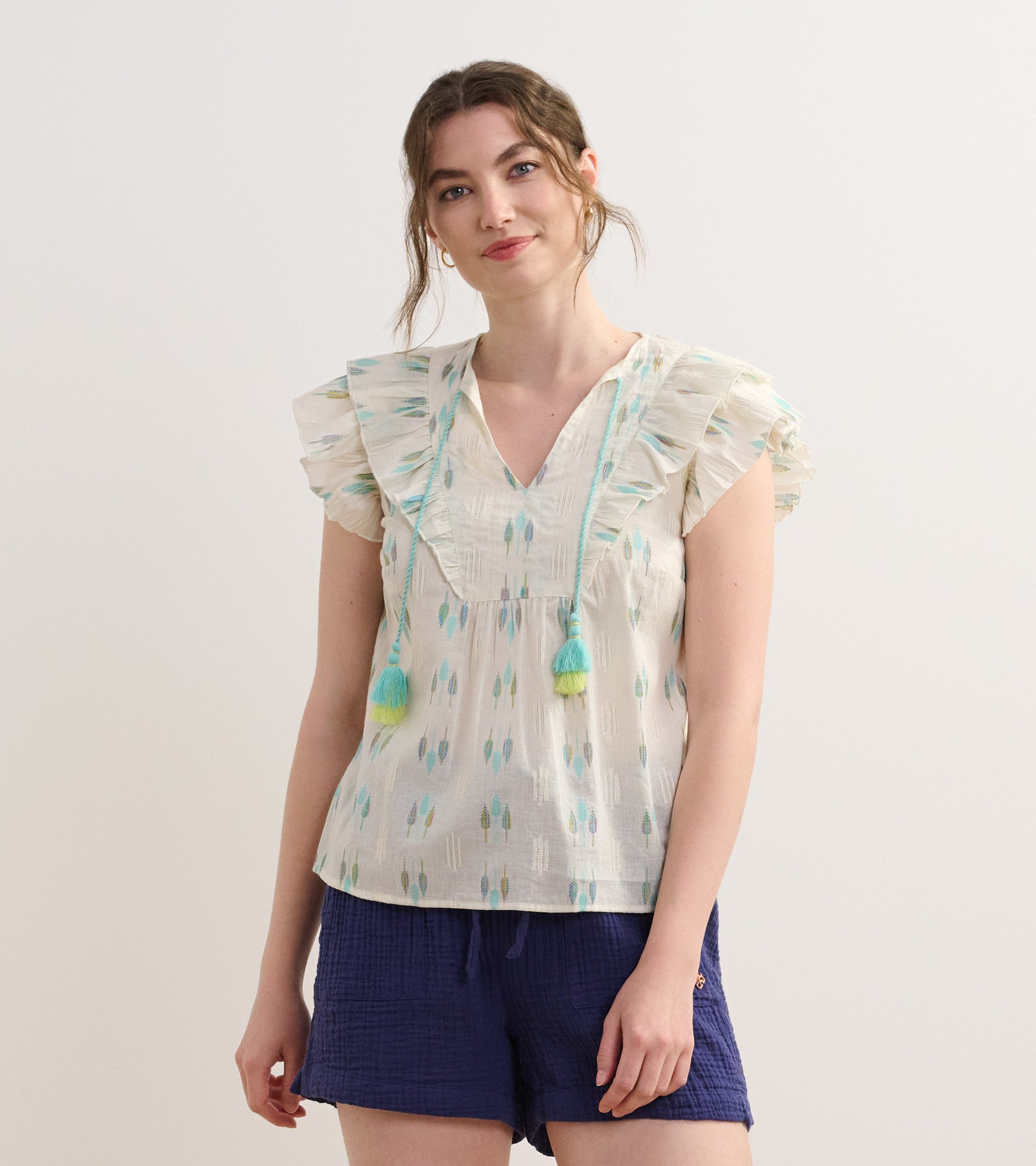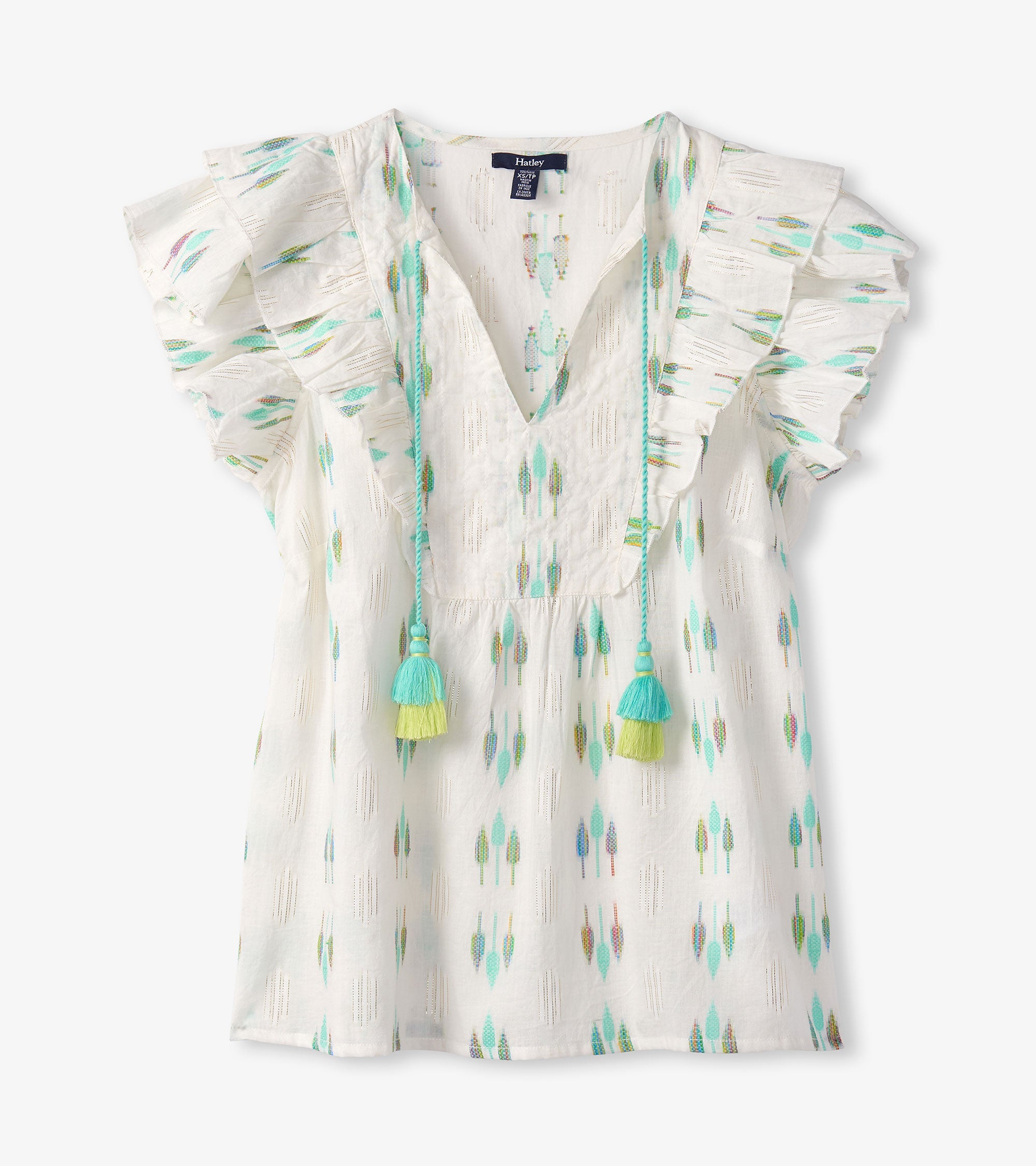 The Alexa Popover in Blue Feather Ikat blends artistic design with everyday wearability. Made from a mix of cotton, polyester, and metallic fibers, it features an open neckline, handcrafted tassels, ruffle sleeves, and a lightweight relaxed fit. The feather ikat pattern adds a touch of bohemian charm, perfect for creative styling. Pair it with neutral bottoms to let the print stand out.