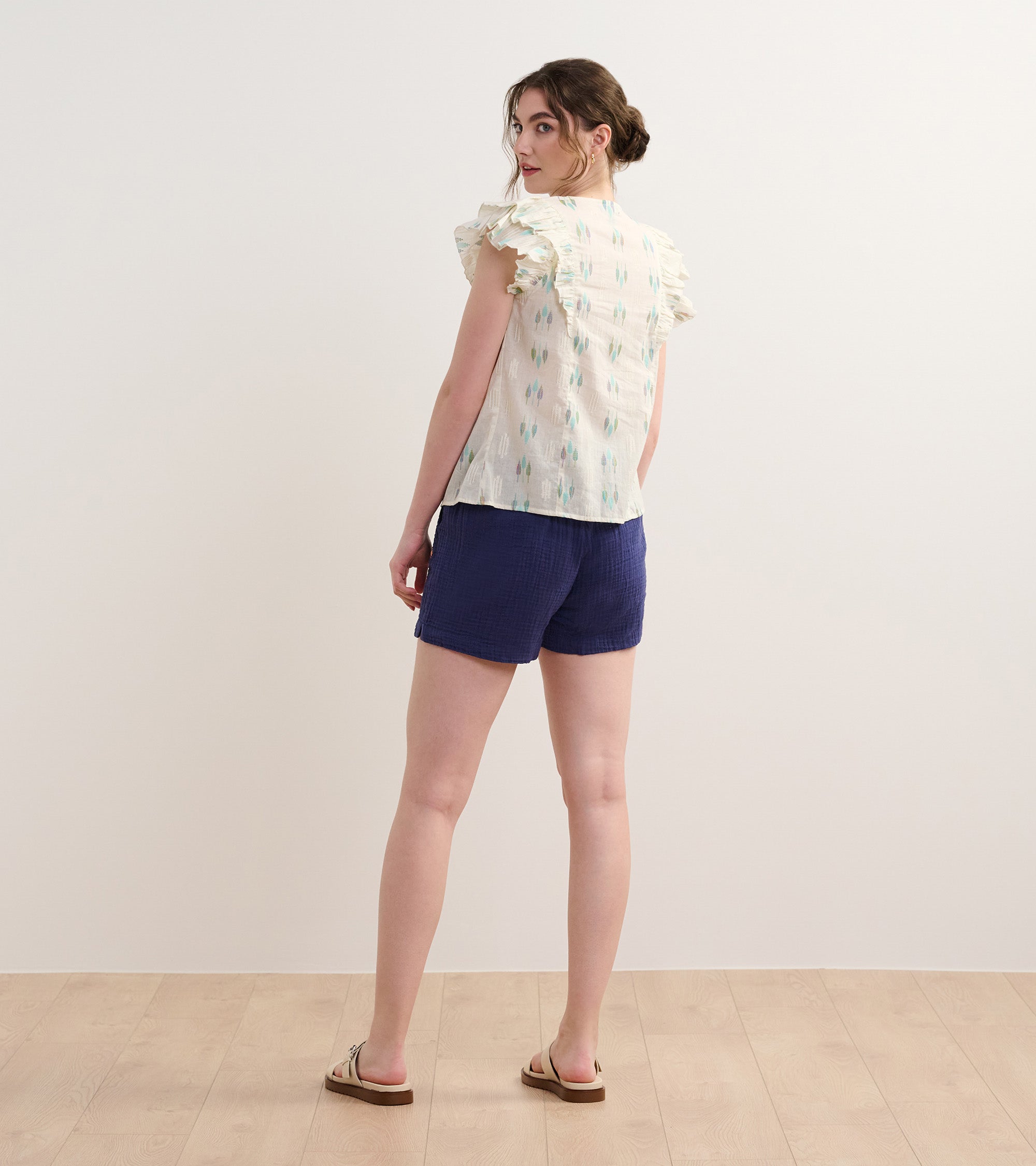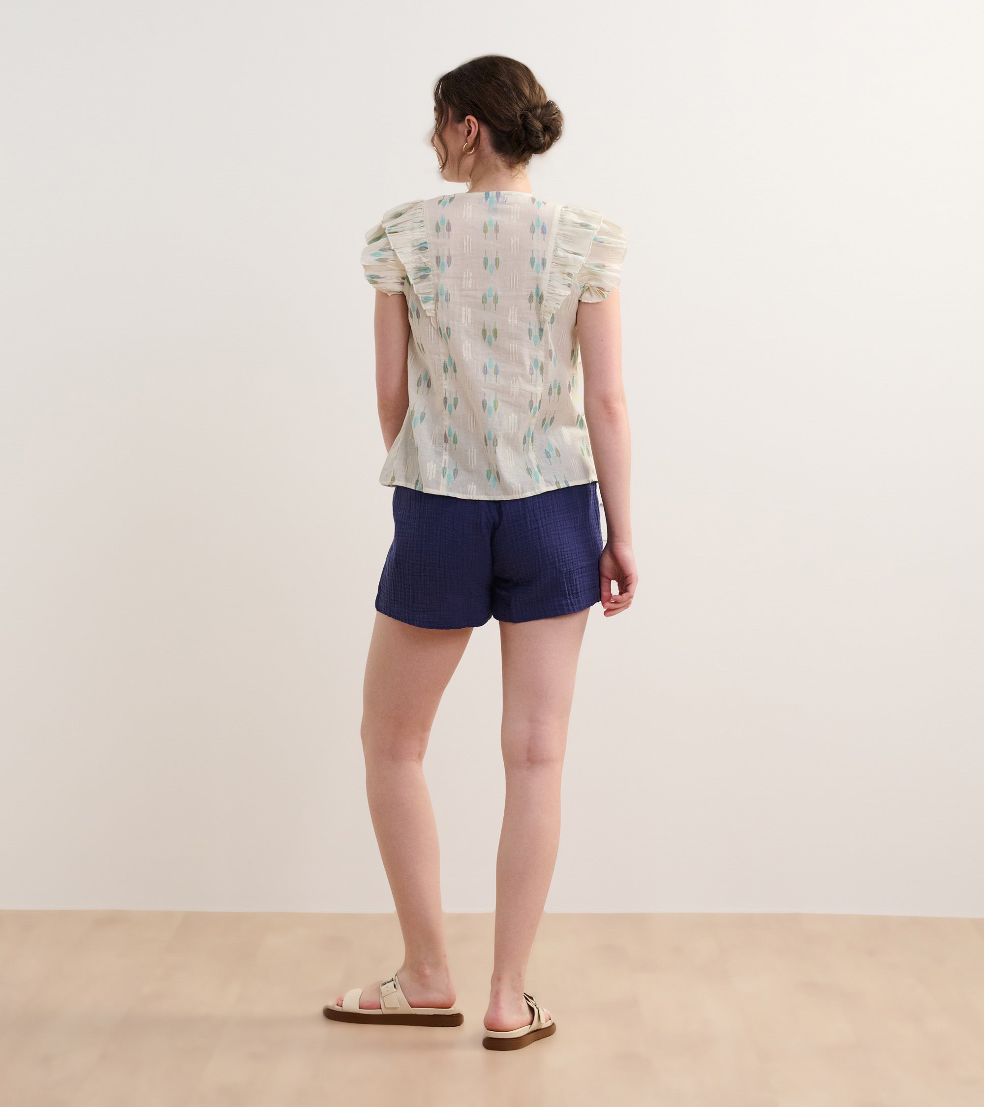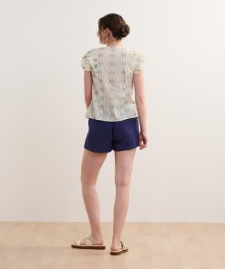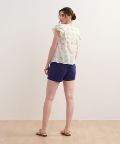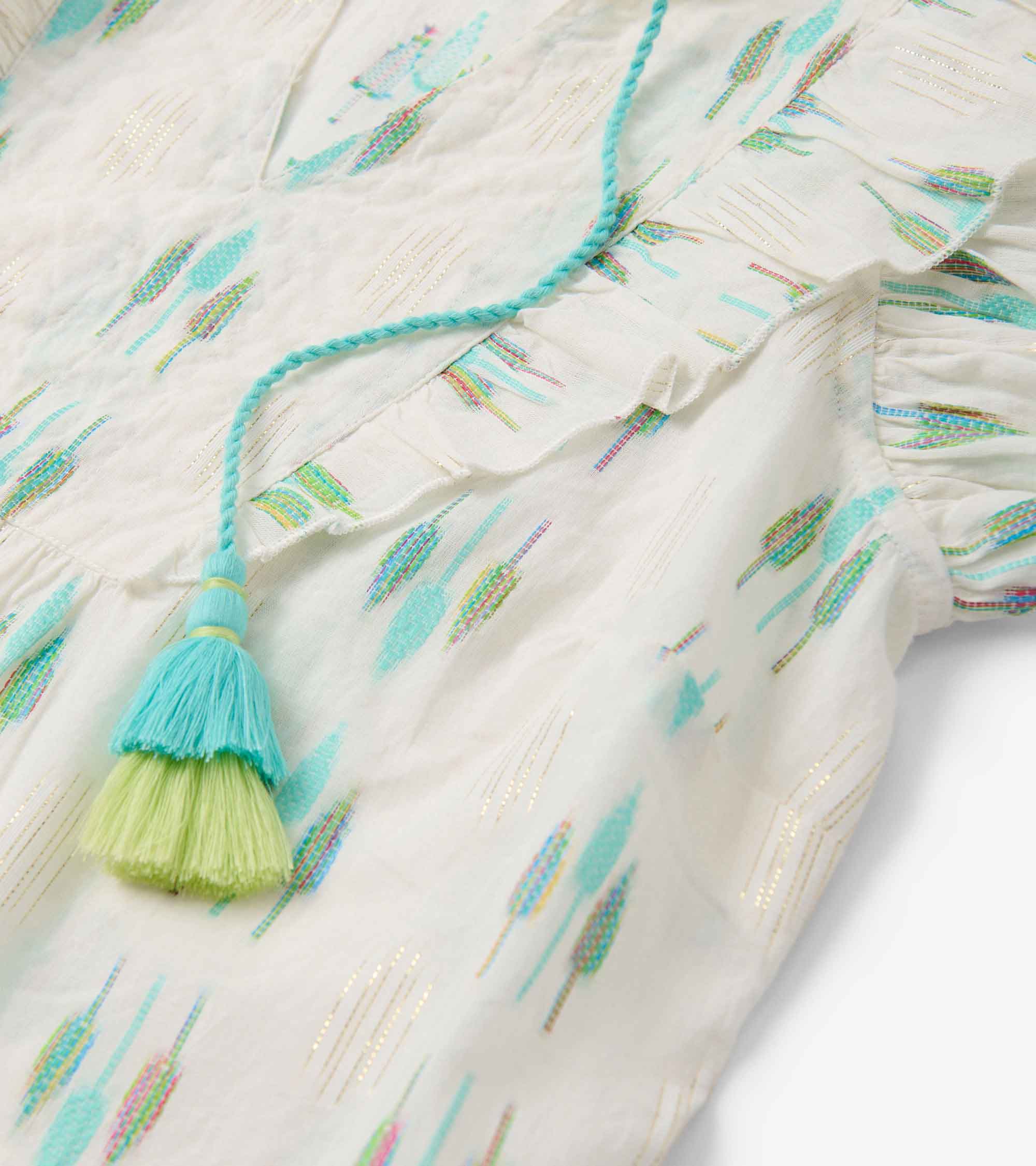The Alexa Popover in Blue Feather Ikat blends artistic design with everyday wearability. Made from a mix of cotton, polyester, and metallic fibers, it features an open neckline, handcrafted tassels, ruffle sleeves, and a lightweight relaxed fit. The feather ikat pattern adds a touch of bohemian charm, perfect for creative styling. Pair it with neutral bottoms to let the print stand out.