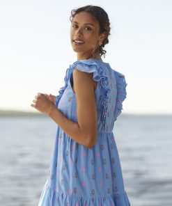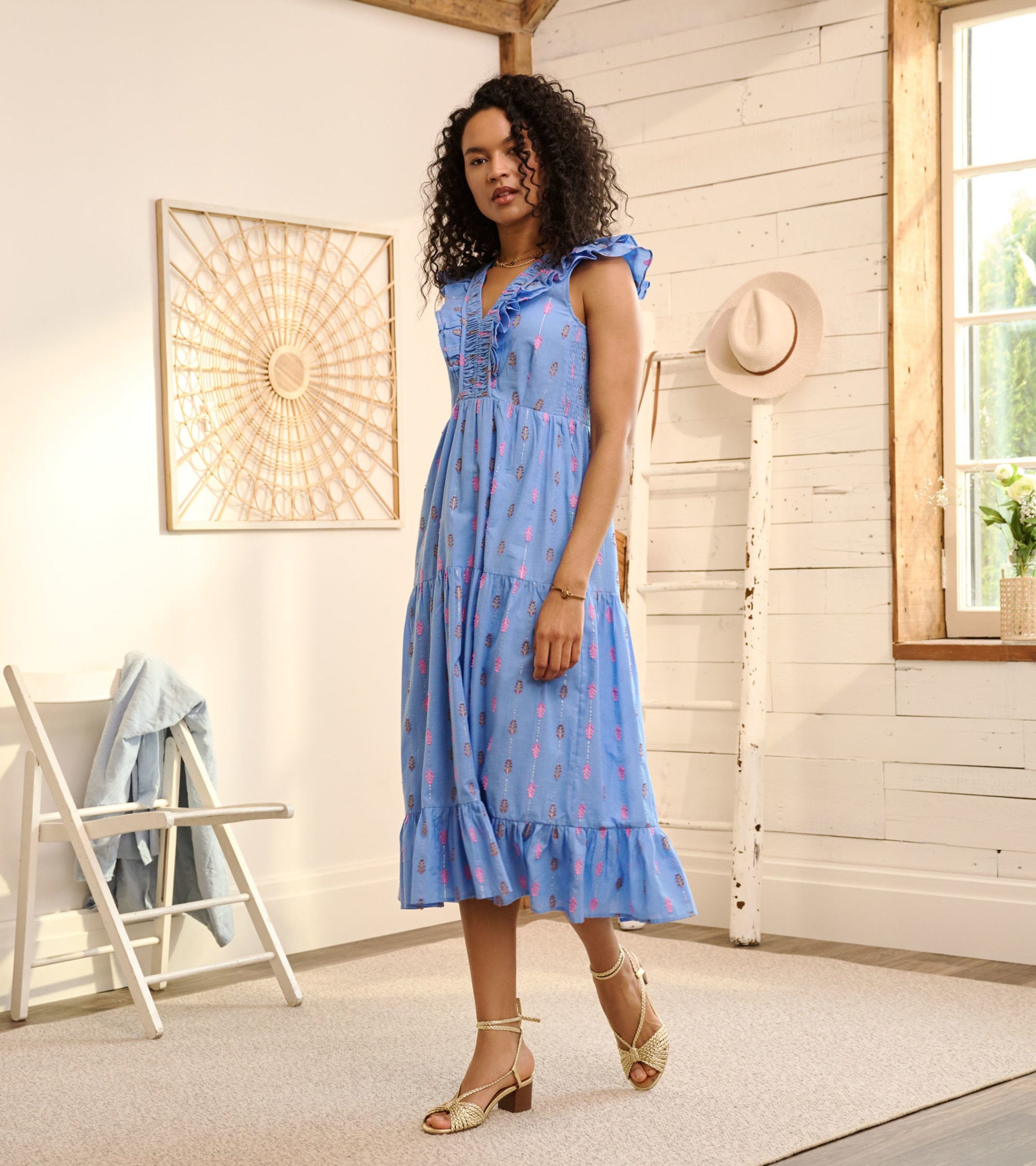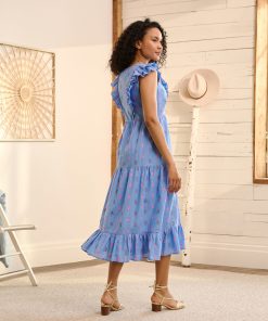 An empire waistline and tiered skirt give this midi dress a graceful fit and fluttery feel. The fully lined bodice flatters with two layers of ruffles meeting at the center V-neck, while the drapes are enhanced by soft smocking details at sides.