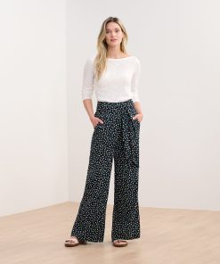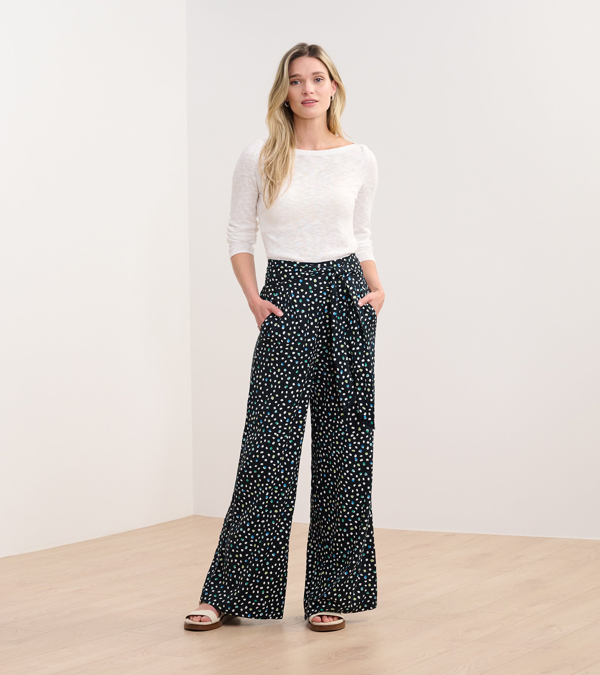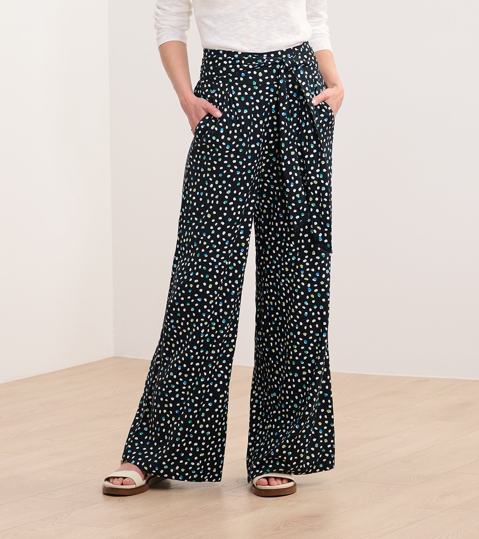The Belted Wide Leg Pants in Multi Dots bring playful sophistication to your wardrobe. Made from lightweight rayon, they feature smocking on the back waist, front slash pockets, inverted box pleats, a flattering wide-leg design and a stylish tie front. A perfect balance, the multi-dot pattern adds a modern touch of whimsy while keeping the classic wide-leg look. Pair them with a fitted top for a balanced silhouette.