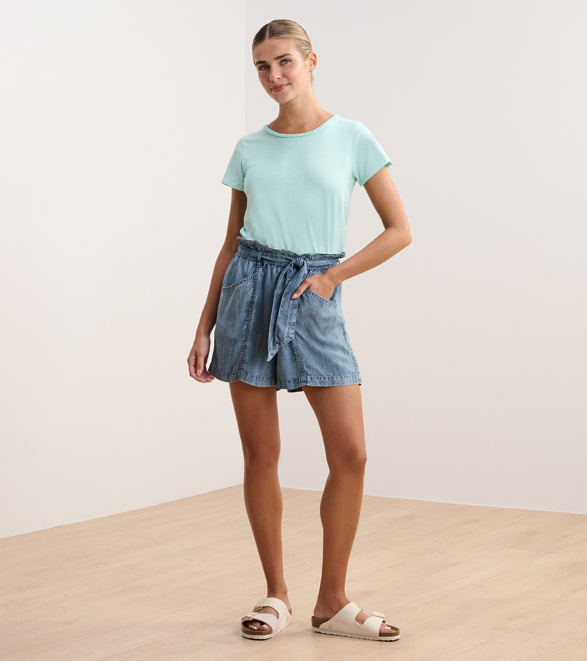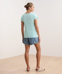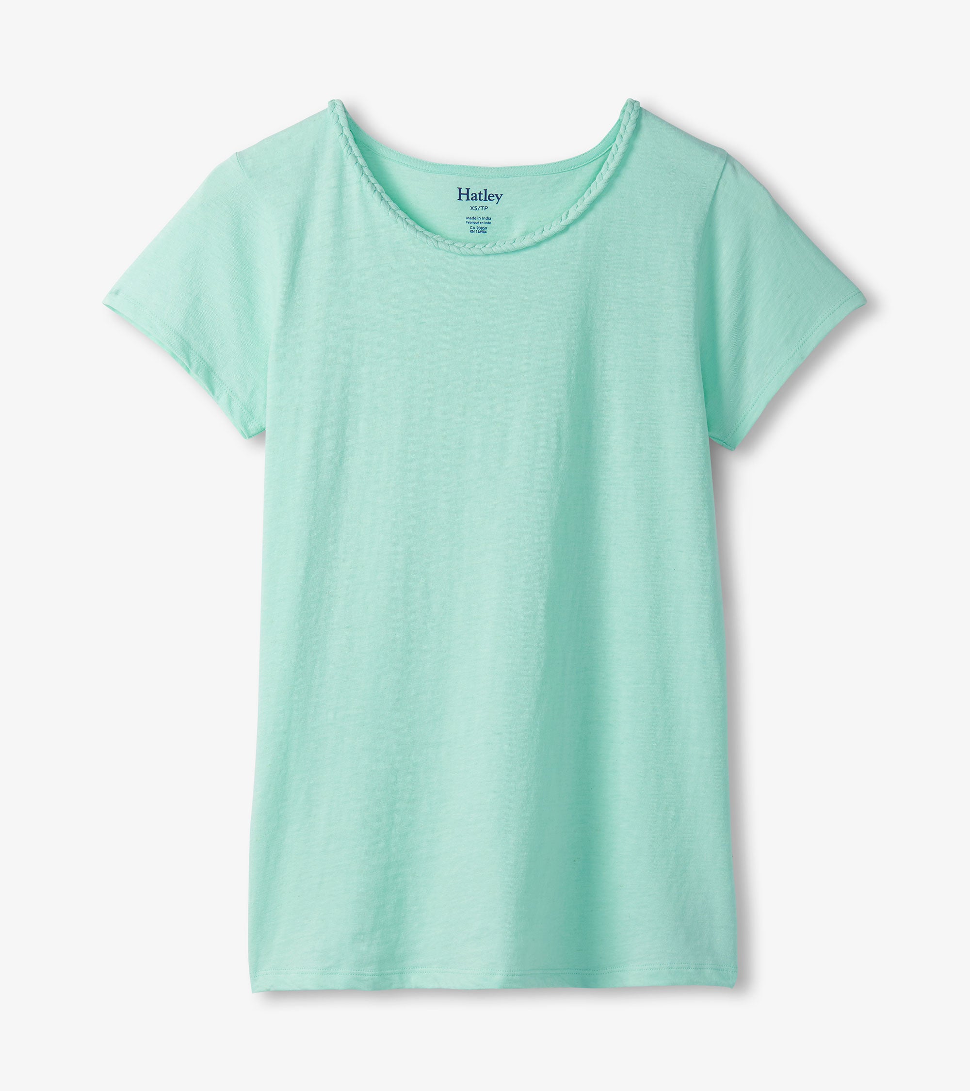 The Braided Neck Tee in Aruba Blue adds a touch of unique charm to your wardrobe. Made from cotton and linen, it features a braided neckline for a subtle yet eye-catching detail. The vibrant Aruba Blue hue brightens up any outfit, making it perfect for summer days. Pair it with white or neutral-toned bottoms for a fresh, clean look.