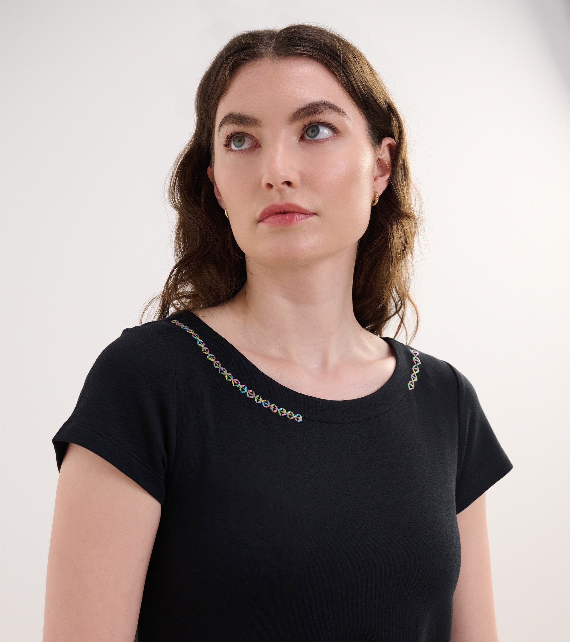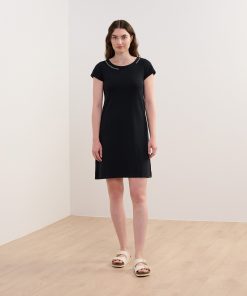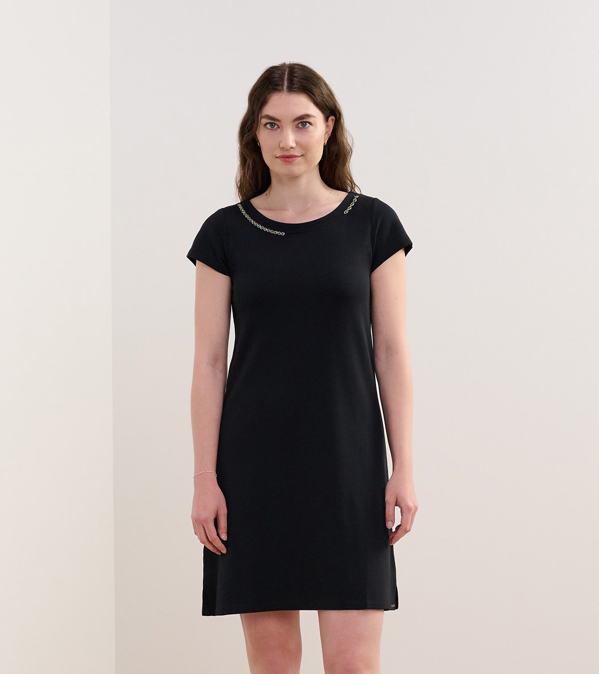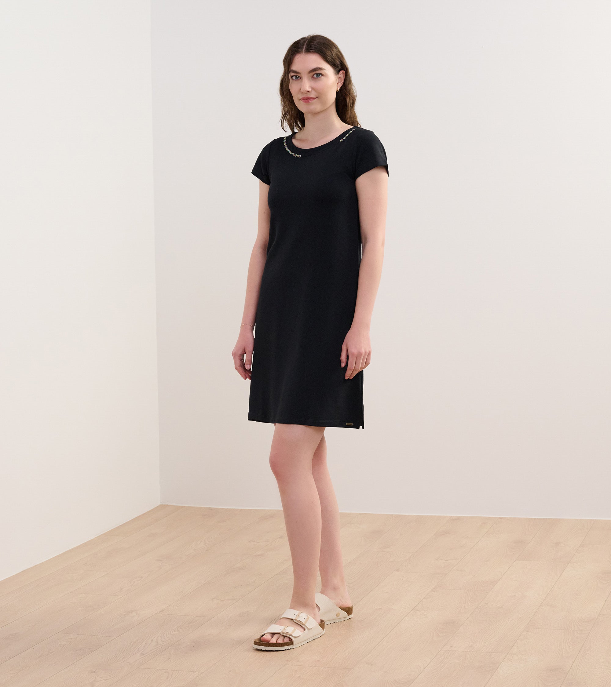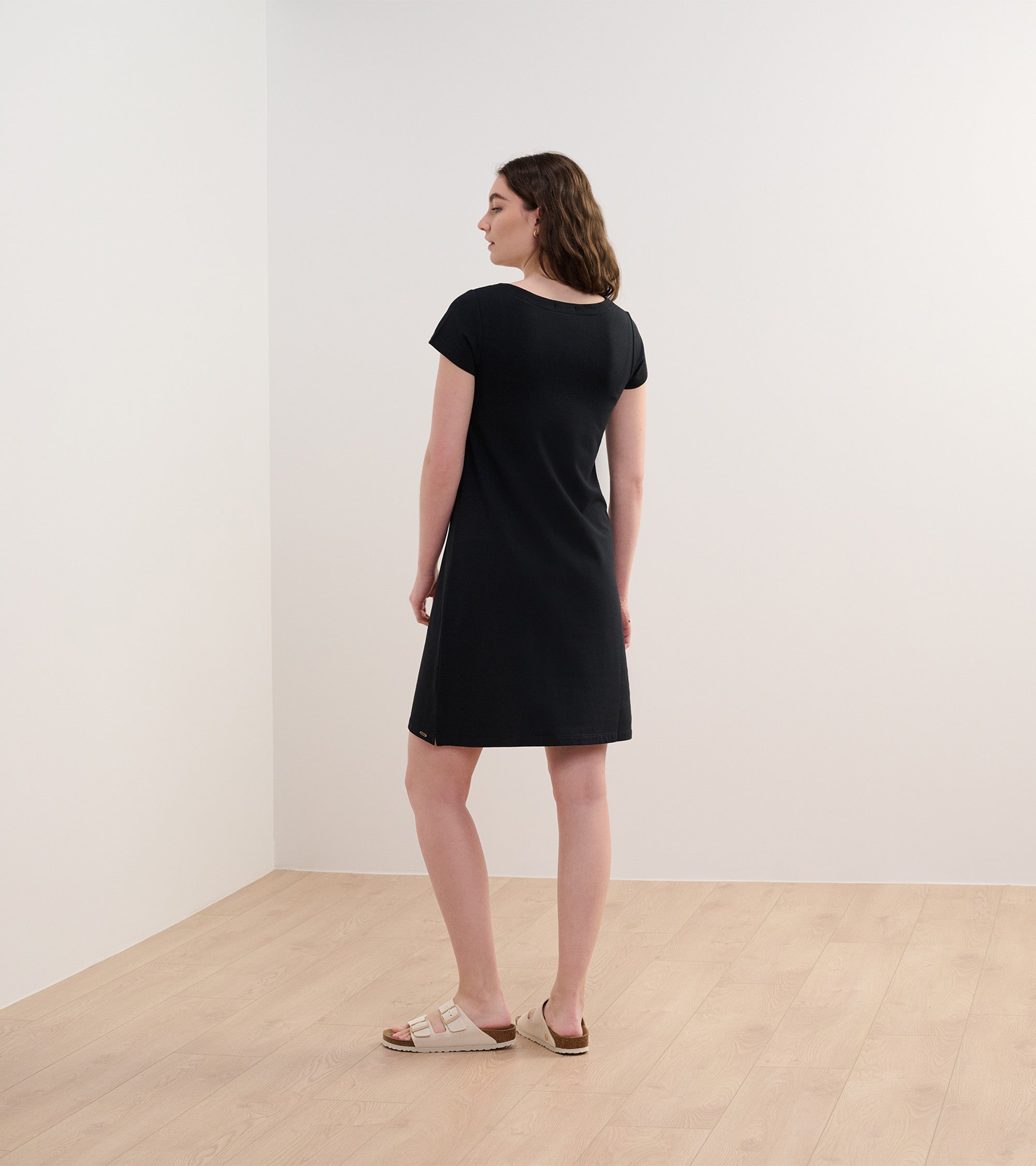 The Brooke Dress in Black French Terry is a modern take on casual elegance. Crafted from a blend of cotton, modal, and spandex, it offers a soft, stretchy feel with a flattering silhouette, an A-line skirt, cap sleeves, and subtle embroidery on the neckline. The French terry fabric provides comfort, making it perfect for day-to-night transitions. Pair it with sneakers or boots for a versatile outfit.