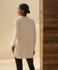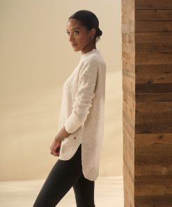 The Cable Knit Tunic in oatmeal heather is a cozy and stylish piece made from a blend of acrylic, nylon, and spandex. The soft, heathered fabric offers warmth, while the tunic length provides coverage and comfort. Ideal for pairing with leggings or slim pants for a relaxed, chic look.