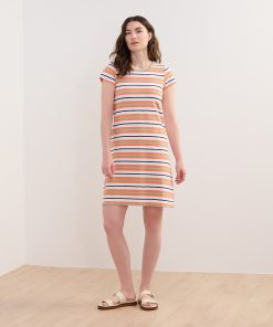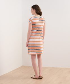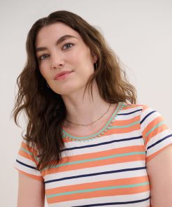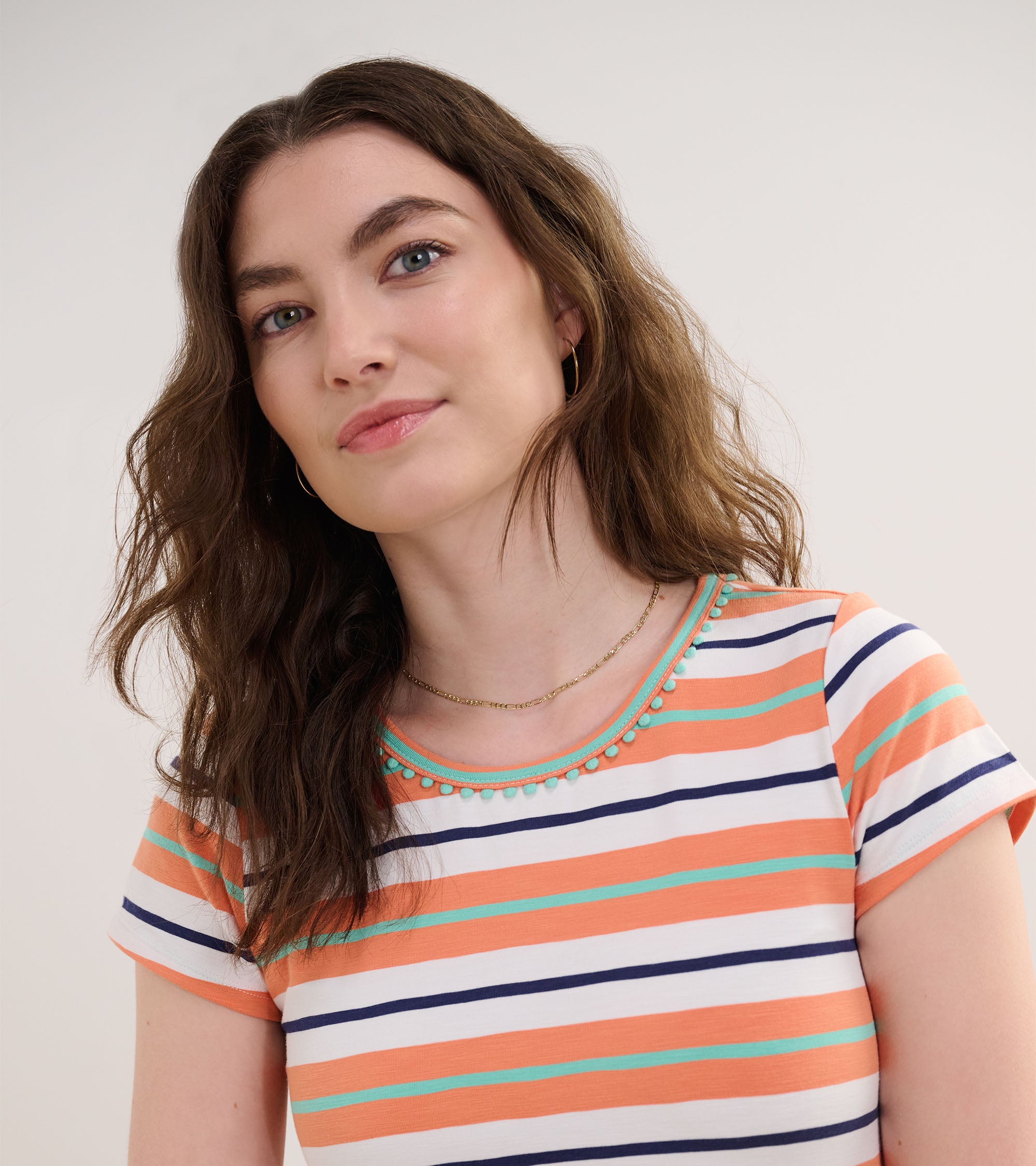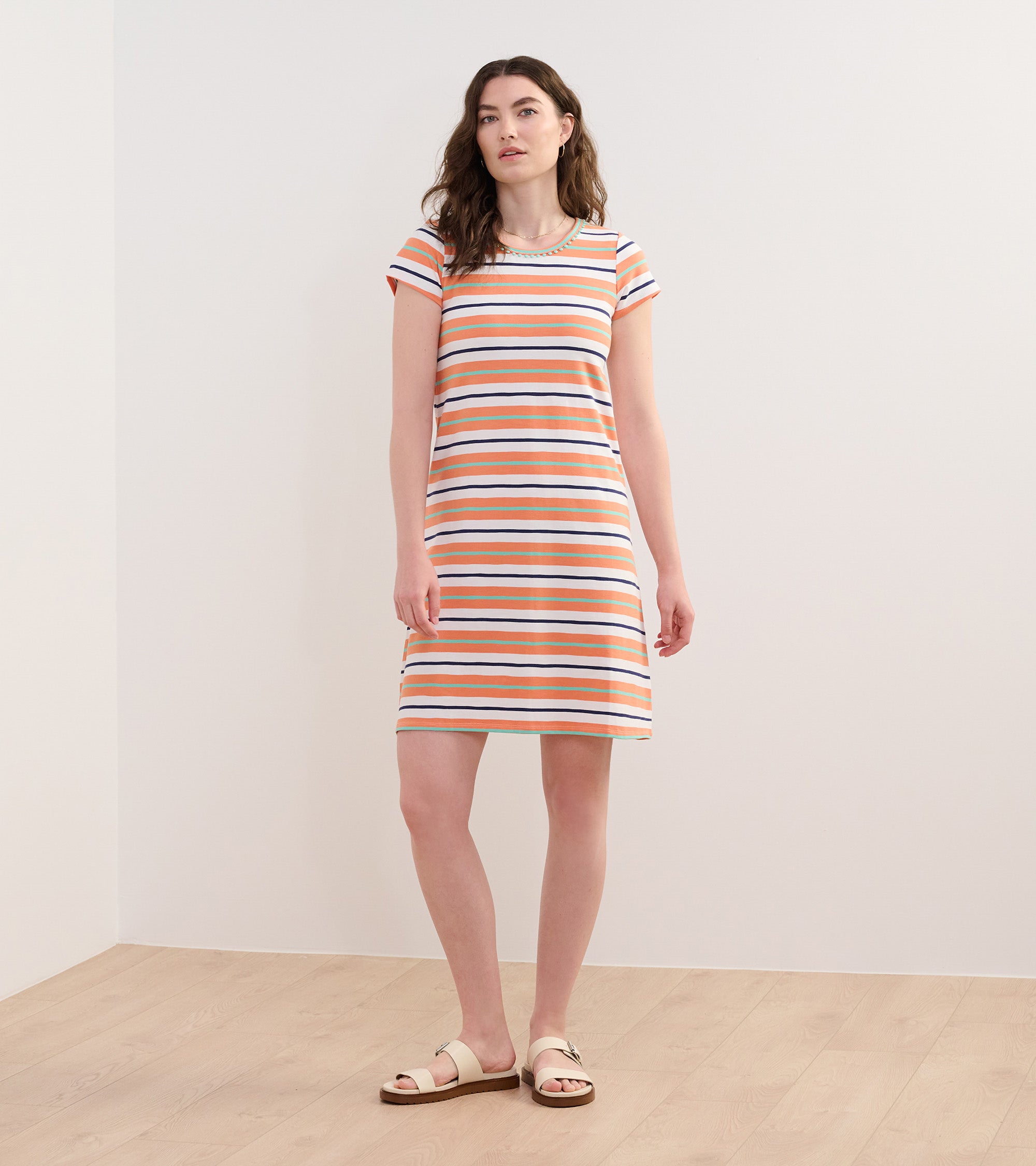 The Cici Dress in Melon Stripes is a cheerful addition to any wardrobe. Made from a cotton, modal, and spandex blend, this A-line-shaped t-shirt dress combines stretch and softness for a comfortable fit that doesn’t cling, pom pom trim on the neckline, and a keyhole closure on the back. The playful striped design in warm melon tones brightens up casual occasions. Pair it with neutral accessories for a balanced look.
