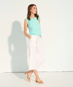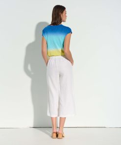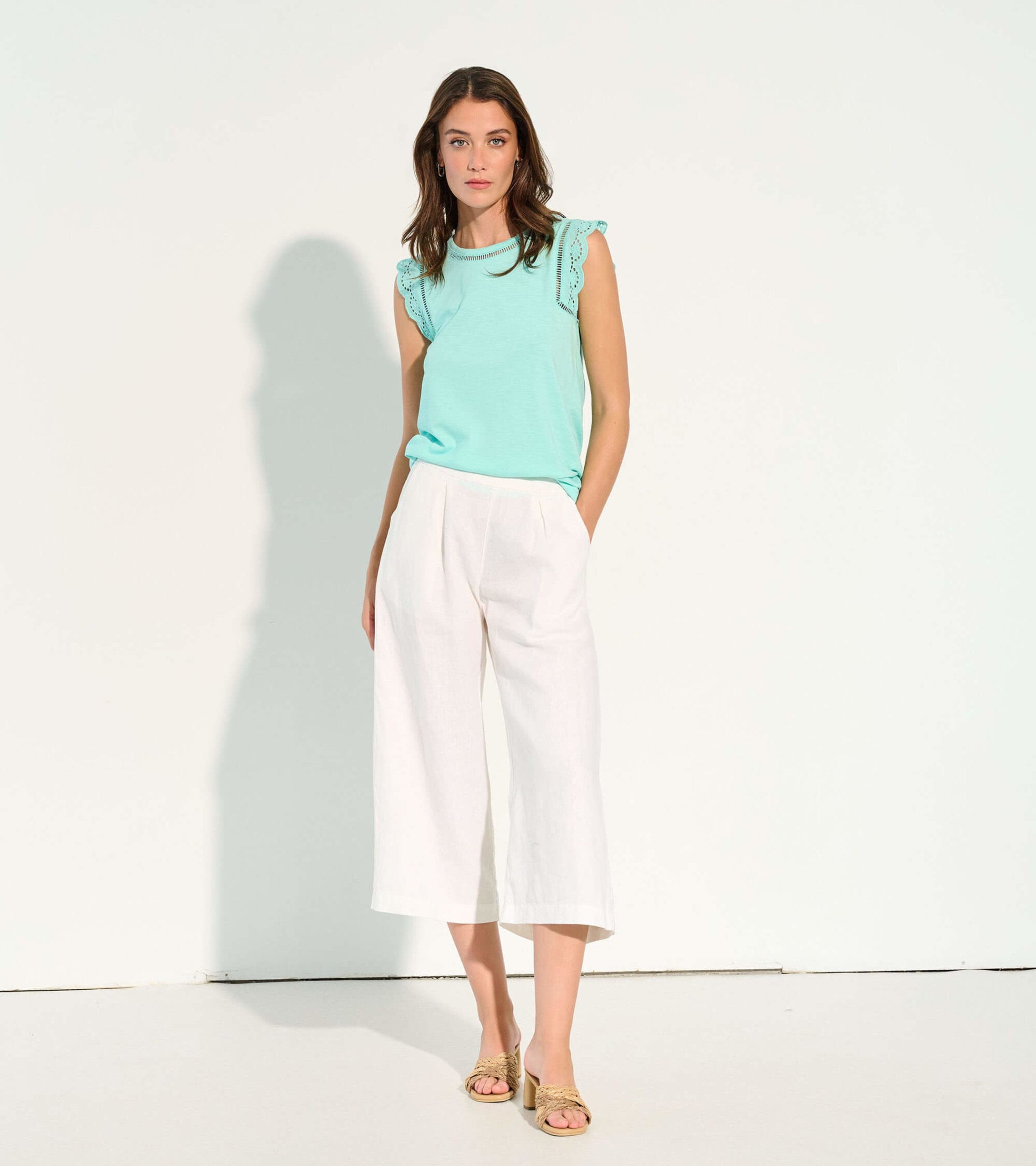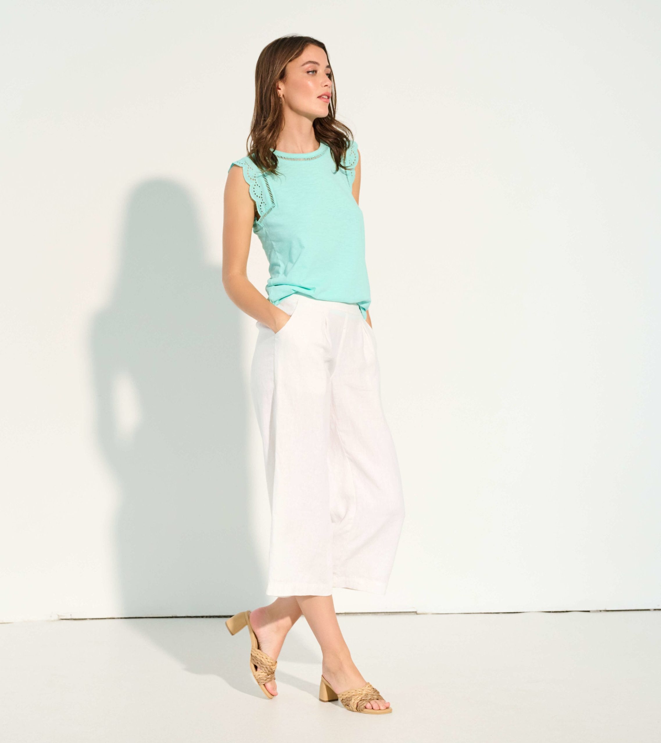Cut from a soft, lightweight and breathable cotton, these culottes are trimmed with rows of embroidered details and designed with a generous fit with straight side seams and rounded slash front pockets. These pants can be worn with a tank for a casual look or dressed up with a blouse!