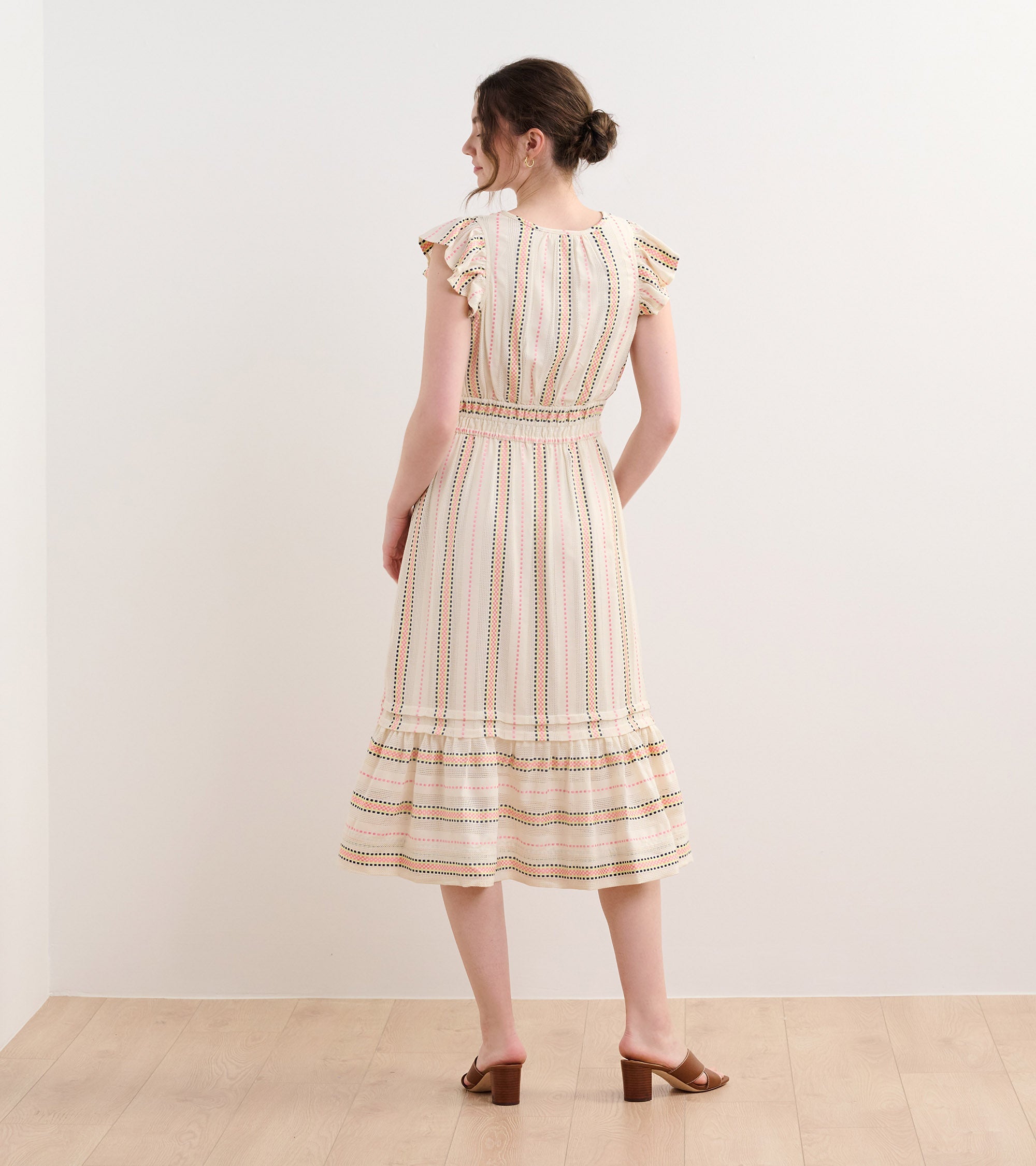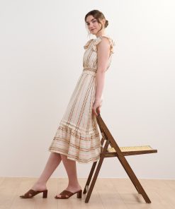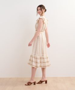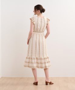 The Fiona Dress in Ribbon Weave Stripes is a refined option for any occasion. Made from a viscose and cotton blend, this fully-lined dress offers a soft breathable feel, subtle flutter sleeves, a two-tiered layered skirt, a hook and eye closure at the bust, and an elegant midi silhouette. The ribbon weave stripe pattern adds unique texture and sophistication while the horizontal stripes on the hem add variation. Style it with heels or flats for a versatile and polished look.