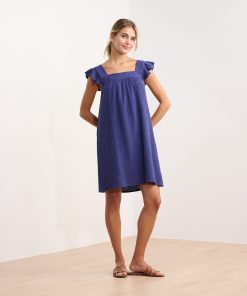 The Flutter Sleeve Dress in Patriot Blue exudes understated sophistication. Made from breathable bonded cotton, it features a square neckline, a cut-out back detail, a flattering trapeze silhouette, and flutter sleeves for a feminine touch. The rich blue tone adds versatility and the wrinkled look makes it suitable for various occasions including traveling. Style it with statement jewelry or keep it simple for a polished look.