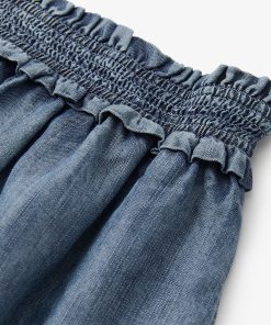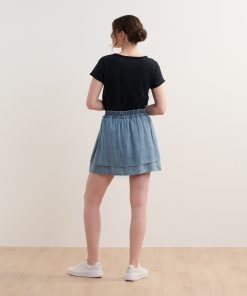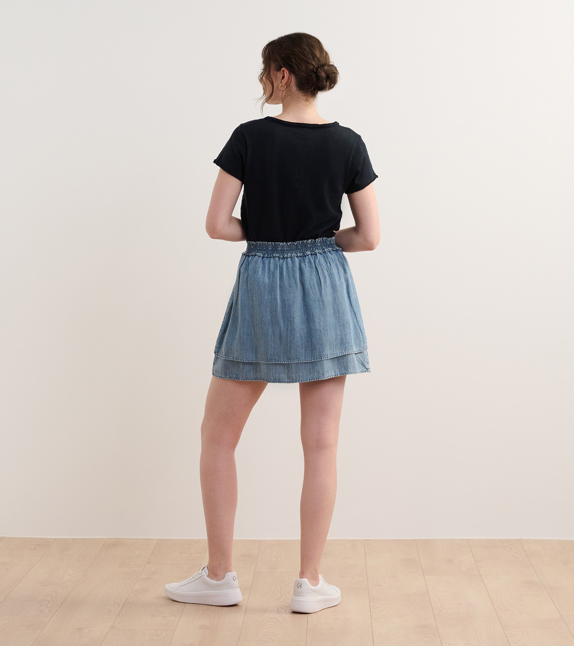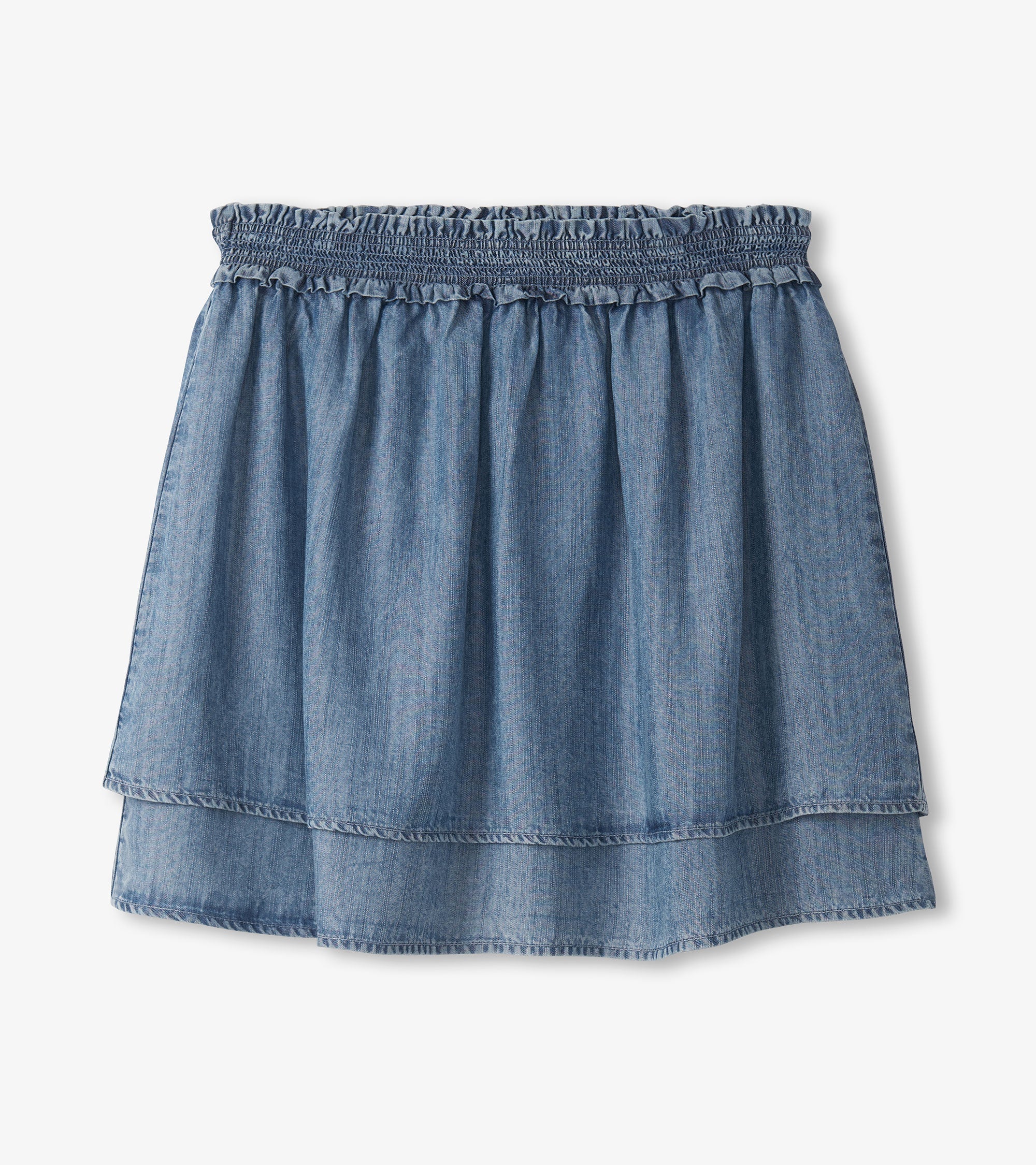 The Layered Smocked Skirt in Blue Acid Wash is a playful and stylish addition to your wardrobe. Made from blue acid rinse tencel, this pull-on skirt features a two-tiered design and smocked waistband for comfort and ease. The acid wash detail adds a modern flair, perfect for casual or semi-formal outings. Pair it with a fitted top for a polished look.