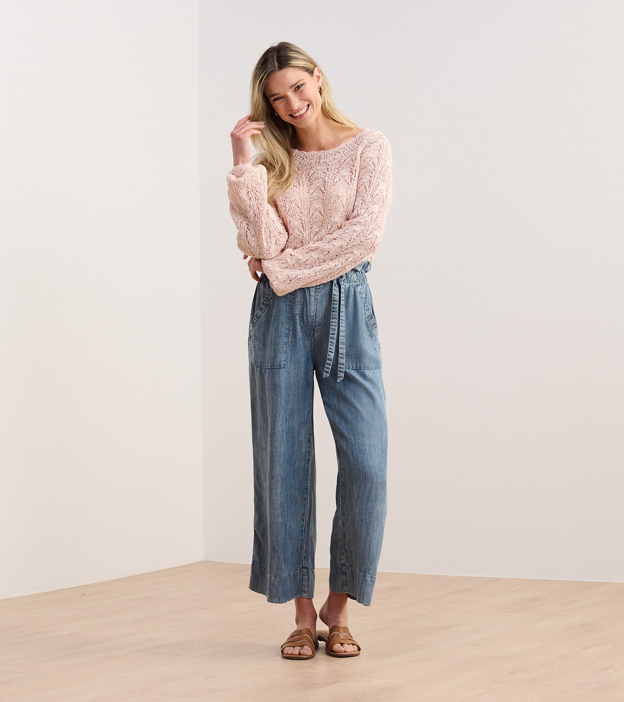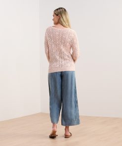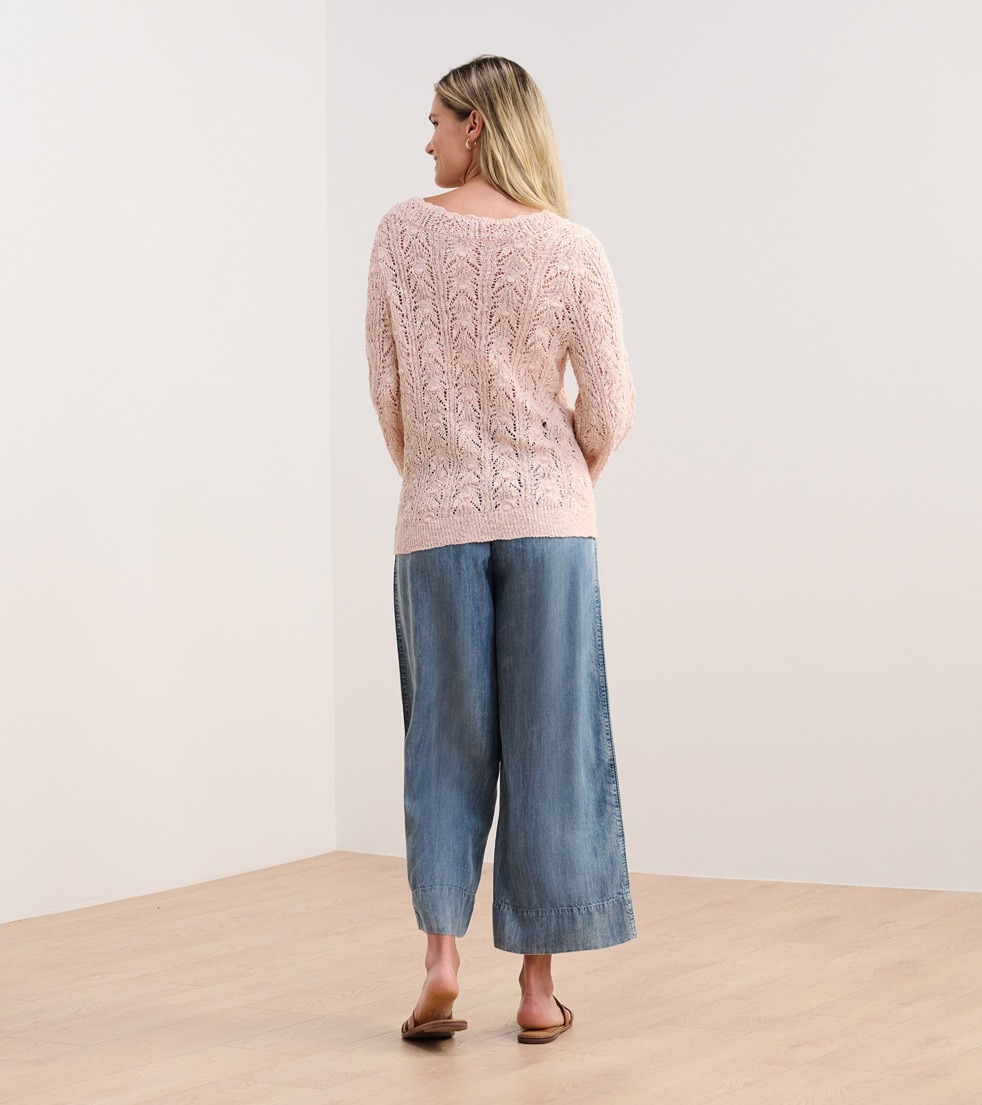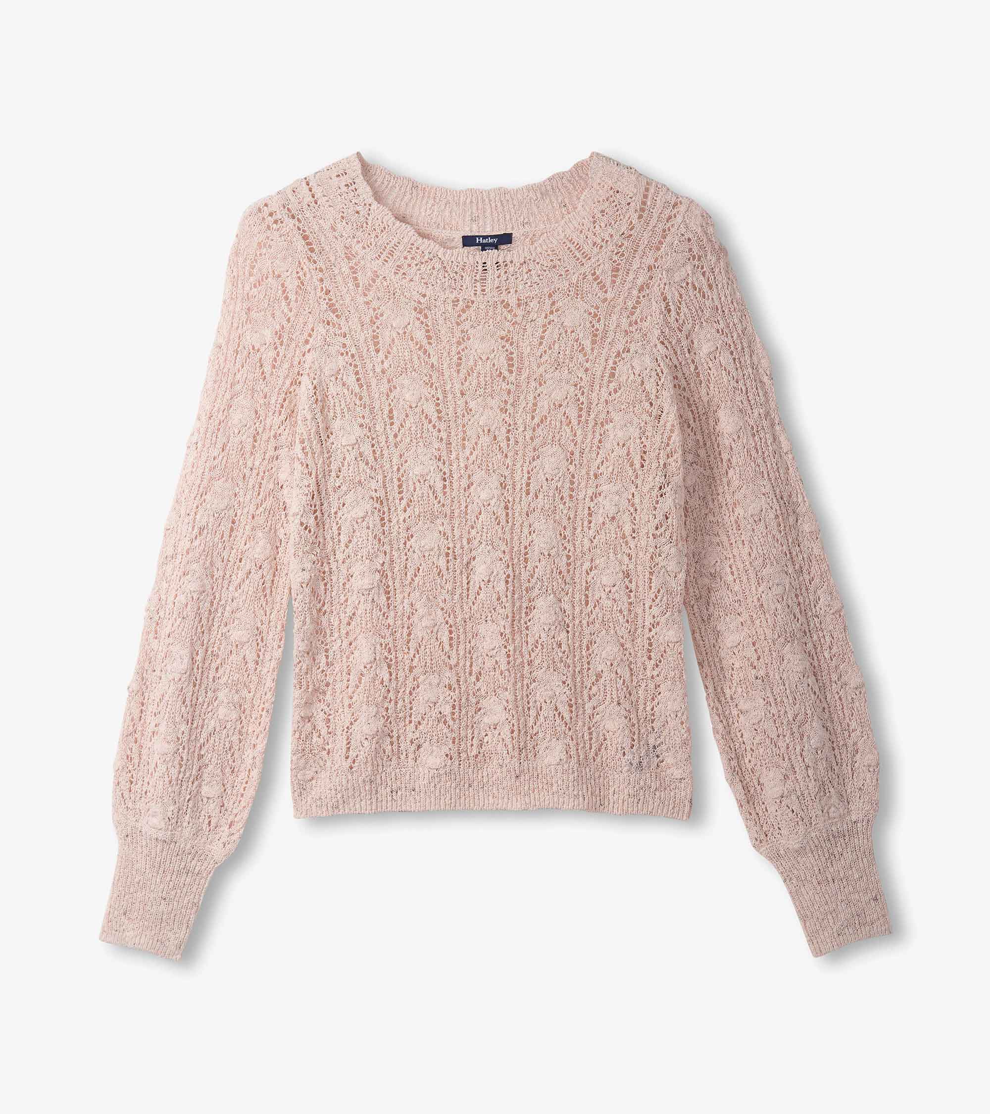 The Pointelle Sweater in Floral Blush is a delicate yet cozy addition to your wardrobe. Made from a blend of cotton, polyester, and bamboo, it features a scalloped neckline, ribbed cuffs, and an intricate pointelle knit design. The soft floral blush hue adds a feminine touch, making it perfect for layering or wearing solo. Pair it with jeans or a skirt for a polished look.