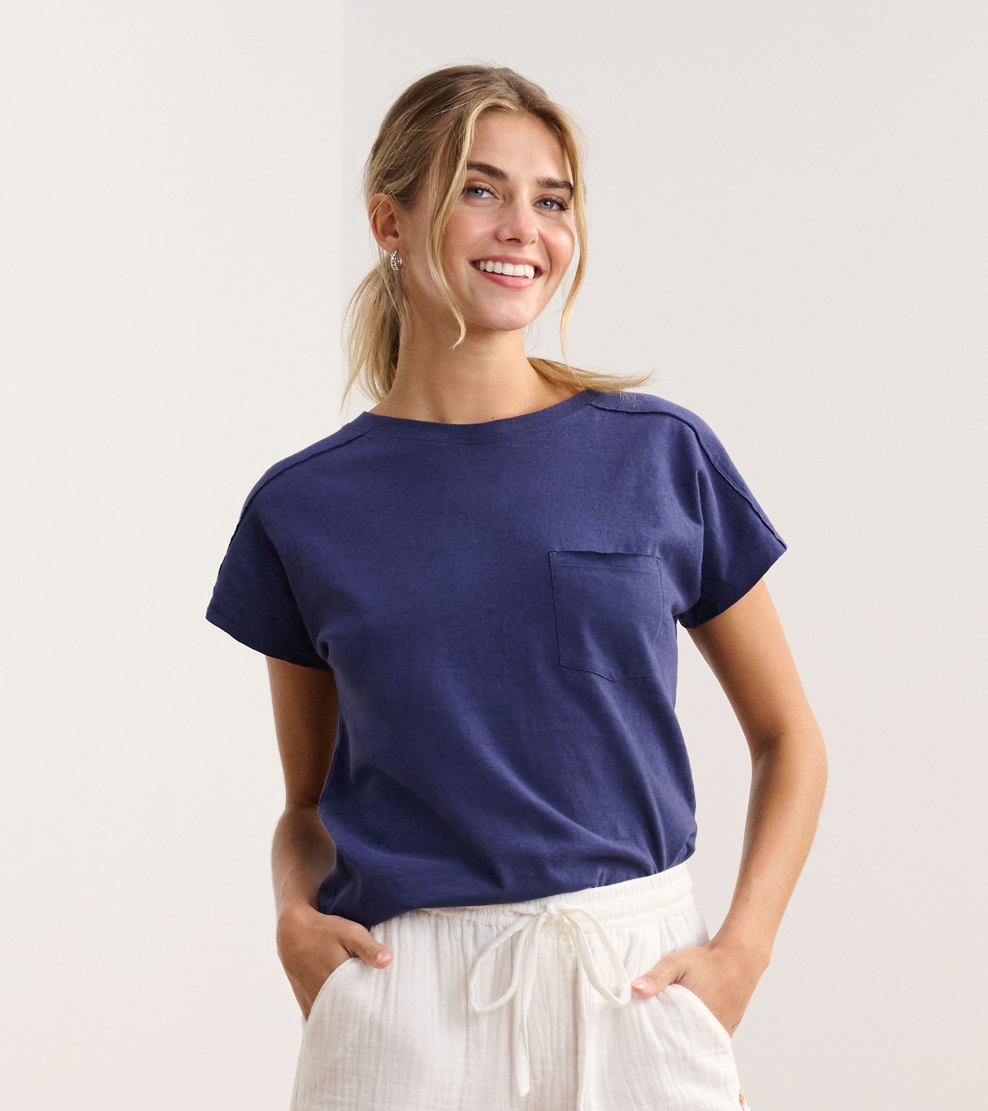The Slouchy Pocket Tee is crafted from a cotton/linen blend for a cool, relaxed vibe. The shoulder details and chest pocket give it a little something extra, while the dolman sleeve adds a fun and flattering touch.