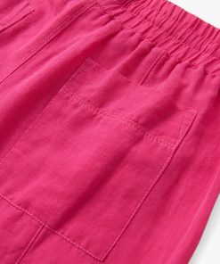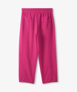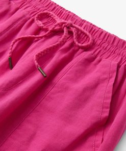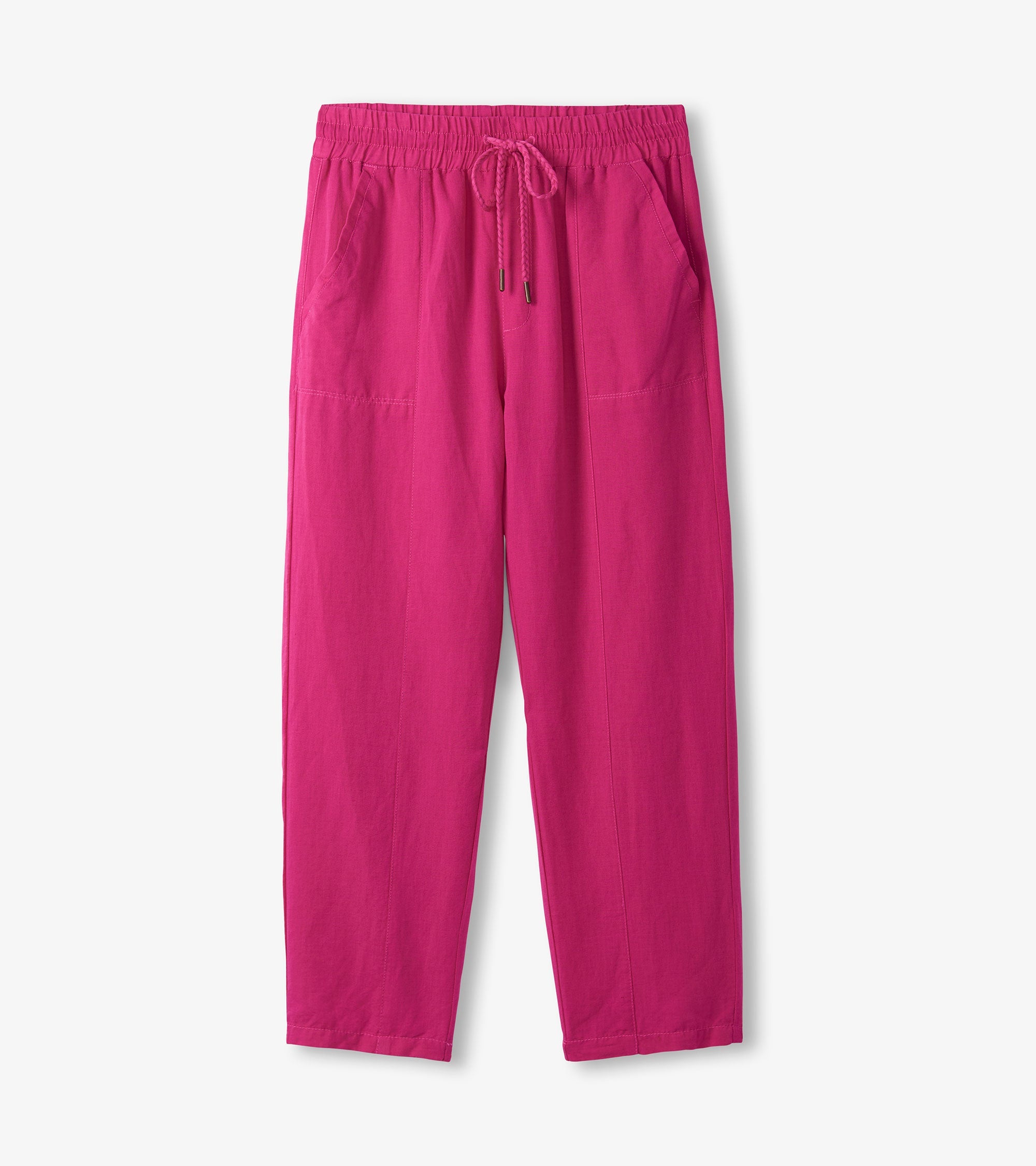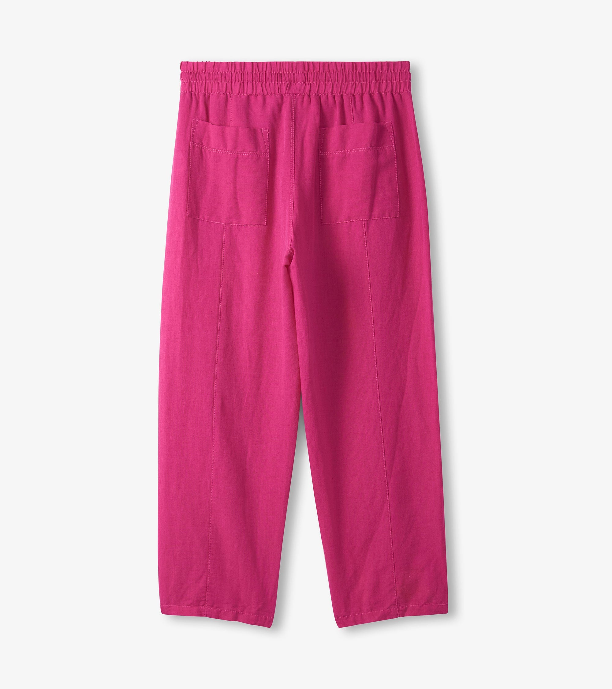 The Straight Leg Linen Pants in Fuchsia are a bold addition to any wardrobe. Made from a breathable linen and cotton blend, this pull-on style features an elastic waist, a functional braided draw cord, stylish center seams on the front and back, a sleek tapered leg design, front and back patch pockets, and lightweight comfort. The vibrant fuchsia shade adds a pop of color that pairs beautifully with neutral or patterned tops. These pants are perfect for workdays or casual outings.