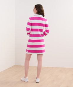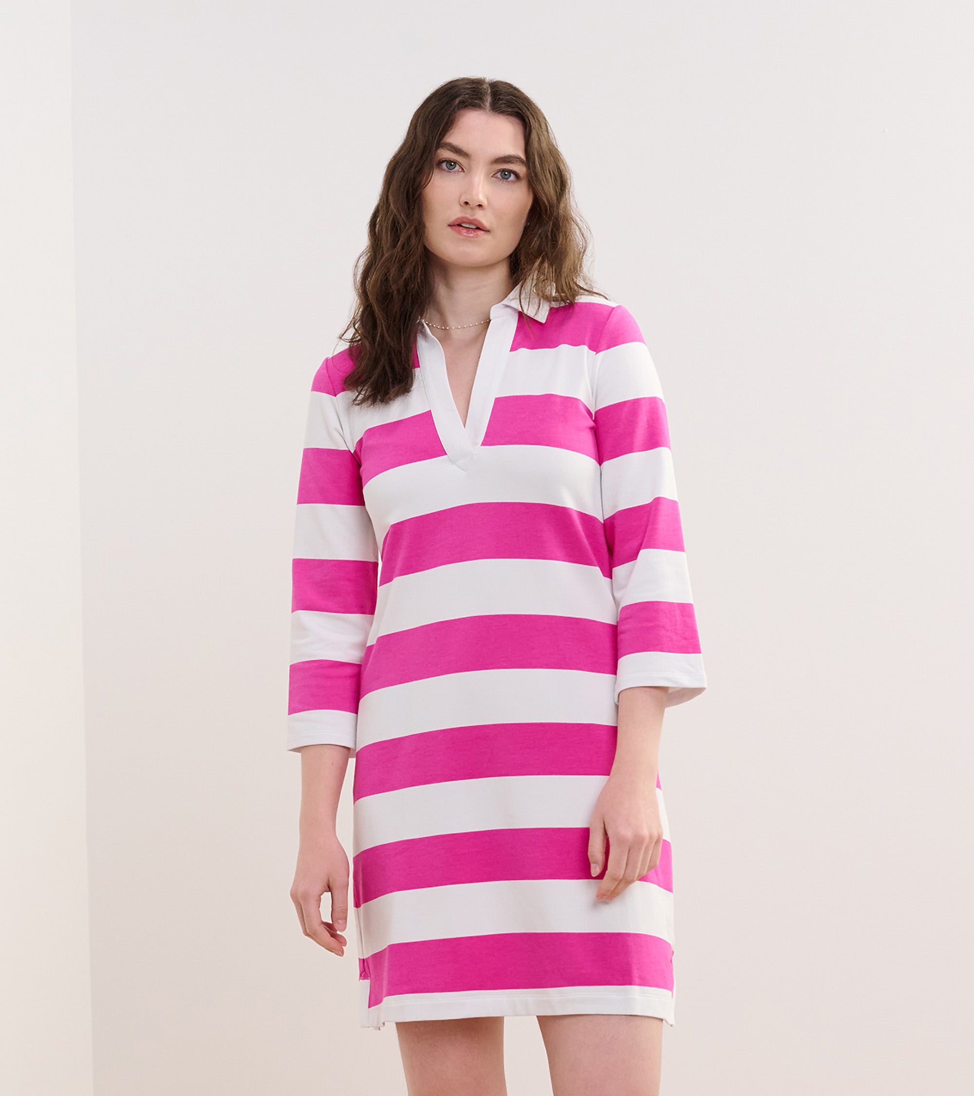 The Taylor Dress in Preppy Pink Stripes adds a fresh twist to a classic pattern. Crafted from ultra soft French terry, it offers a woven collar, 3/4 sleeves, a flattering A-line silhouette for a comfortable fit with a hint of stretch. The soft pink stripes make it ideal for daytime events or casual gatherings. Style it with neutral sandals or sneakers for a laid-back yet polished look.